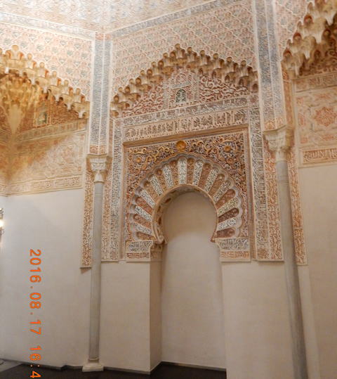 ホテルからカテドラルの南西面に隣接するビブランブラ広場に出ました。15時43分です。14時頃から夕方まではこのようにゆっくりと食事をしている光景をよくみかけます。 ![]() 撮影:鷹取敦 Nikon COOLPIX S9900 カテドラルの南川にはアルカイセリアがあります。アルカイセリアはイスラム時代に市場だったところで、現在は土産物屋がぎっしりと並んでいます。下の写真の入口の上に「ALCAICERIA」とあるのが分かります。 ![]() 撮影:鷹取敦 Nikon COOLPIX S9900 アルカイセリア以外の街路にも土産物屋が並んでいるのですが、ここだけは建物の造りがまわりと違っています。 ![]() 撮影:鷹取敦 Nikon COOLPIX S9900 ■カテドラル(カテドラル・サンタ・マリア・デ・ラ・エンカナシオン)、王室礼拝堂カテドラルは、グラナダが陥落した後、イザベル女王の命により、モスクの跡に1518年から建設が始められました。当初はゴシック様式として進められましたが、1528年以降はサン・ヘロニモ修道院を手がけた建築家ディエゴ・デ・シロエが担当し、装飾部分にムデハル様式を取り入れたプラテレスコ様式で最大の建物となりました。その後、ルネサンス様式で1704年まで200年弱にわたり建設が進められましたが塔の部分は未完成です。 カテドラルつながっている王室礼拝堂(ロイヤル チャペル)には、カスティーリャ女王イサベルとその夫であるアラゴン国王フェルナンド2世の墓があります。二人の次女のフアナ王女と、その夫であるフェリペ1世(神聖ローマ皇帝マクシミリアン1世(ハプスブルク家)の息子)も葬られています。 ちなみに、フアナとフェリペ1世の子であるカール5世(神聖ローマ帝国皇帝、スペイン国王としてはカルロス1世)が王位につき、カスティーリャ、アラゴン、神聖ローマ帝国(ハプスブルグ帝国)の領土を統治し、大航海時代の只中、その絶頂期を迎えることとなります。 また、博物館には彫刻、タペストリー、16〜18 世紀の宗教画等が収められています。 通りを抜けるとカテドラルが目前に現れ視界を覆いました。 ![]() 撮影:鷹取敦 Nikon COOLPIX S9900 下はグーグルマップで立体表示したカテドラルです。右上の半円形の部分が王室礼拝堂です。左上の塔が未完成であることが分かります。 ![]() 出典:グーグルマップ カテドラル博物館は16時まで閉館時間中だったため、カテドラル正面に回りました。 ![]() 撮影:鷹取敦 Nikon COOLPIX S9900 左上の未完成の塔が見えます。 ![]() 撮影:鷹取敦 Nikon COOLPIX S9900 ![]() 撮影:鷹取敦 Nikon COOLPIX S9900 カテドラルの見学は10ユーロです。音声ガイドで英語の解説を聞きながらカテドラルを見学します。 ![]() 撮影:鷹取敦 Nikon COOLPIX S9900 ![]() 撮影:鷹取敦 Nikon COOLPIX S9900 ![]() 撮影:鷹取敦 Nikon COOLPIX S9900 下はパイプオルガンです。 ![]() 撮影:鷹取敦 Nikon COOLPIX S9900 下の2枚は主祭壇とその天井です。 ![]() 撮影:鷹取敦 Nikon COOLPIX S9900 ![]() 撮影:鷹取敦 Nikon COOLPIX S9900 ![]() 撮影:鷹取敦 Nikon COOLPIX S9900 ![]() 撮影:鷹取敦 Nikon COOLPIX S9900 イサベル女王、フェルナンド2世、フアナ王女、フェリペ1世の墓のある部分は撮影禁止となっていますが見学できました。 カテドラル博物館の入口はカテドラルの正面から見て右側面にあります。4ユーロです。中は撮影禁止なので下の入口の写真だけです。 ![]() 撮影:鷹取敦 Nikon COOLPIX S9900 ■マドラサカテドラル博物館の向かいにはマドラサがあります。 マドラサとは、イスラム世界における高等教育機関です。1349年にナスル朝グラナダ王国のユースフ1世によって建設されたマドラサで、ユースフ大学という名でも知られています。1500年カトリック両王はグラナダ市の最初の市議会議(聖堂参事会、聖職者を集めて決議を行う組織)をここに定めました。そのため「旧市庁舎」と呼ばれています。1722年〜1729年にかけてバロック様式で改築されました。 ムデハル様式の16世紀の別館と、マドラサの祈祷室、ムデハル様式の格子天井(1500年)等が保存されています。 入口(ファサード)はバロック様式となっています。 ![]() 撮影:鷹取敦 Nikon COOLPIX S9900 ![]() 撮影:鷹取敦 Nikon COOLPIX S9900 イスラム時代の壁面や天井が保存されている1階と2階を見学することができます。各部屋の説明が書かれた紙を渡されます。これは出る時に返却します。 ![]() 撮影:鷹取敦 Nikon COOLPIX S9900 ![]() 撮影:鷹取敦 Nikon COOLPIX S9900 壁面の漆喰の装飾が保存されています。下はメッカの方向を示すミフラーブです。 ![]() 撮影:鷹取敦 Nikon COOLPIX S9900 床は一部がガラスとなっており、その下の遺跡が見えるようになっています。 ![]() 撮影:鷹取敦 Nikon COOLPIX S9900 下は階段の吹抜けの天井です。チュリゲーラ様式を施した18世紀のドームです。 ![]() 撮影:鷹取敦 Nikon COOLPIX S9900 中庭を囲む回廊です。本来は上は空が見えるはずですが、保存のため雨が入らないようにガラスの天井がついています。 ![]() 撮影:鷹取敦 Nikon COOLPIX S9900 2階は会議室になっていますが天井はイスラム様式となっています。 ![]() 撮影:鷹取敦 Nikon COOLPIX S9900 入口を入ったところの像です