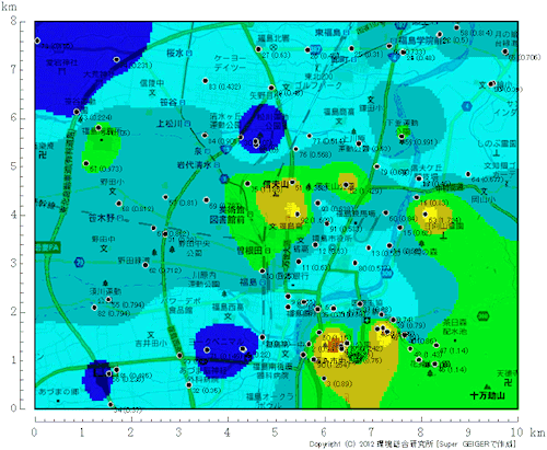 注)分布図は、いずれも青山貞一・池田こみちが2012年5月3日に福島市内約80カ所で測定した空間放射線量率データをもとにスプライン補間計算し分布図化したものです。 |