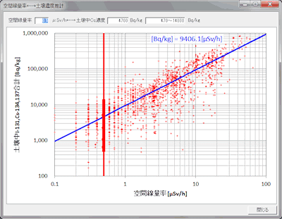 - 実測データより統計解析した関係を用いて、土壌中セシウムの濃度と空間放射線量の関係を簡易に推計できます。