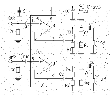 そこでこの基板と、ケース、2連ボリューム、パイロットランプ(LED)、入力端子(RCA型)、スピーカー端子(陸軍型)などを同じショップでまとめ買いし、自宅で自作した。 かかった費用は5300円程度。何しろ超小型である。熱もでず歪率やS/Nも相当低そうだ。 ただし、この基板完成品の回路は先に示した回路に比べるとLSIの入出力系のコンデンサ、抵抗が簡素化してあり、ほぼ以下の回路となっている。電圧は12〜28Vの範囲だが、いずれも放熱板が必要。実質的製作時間は2時間程度だ。 以下は、最終的に用いた回路。ただし、DC電圧は安定化した15Vとした。 ![]()
