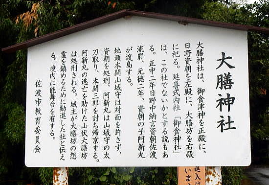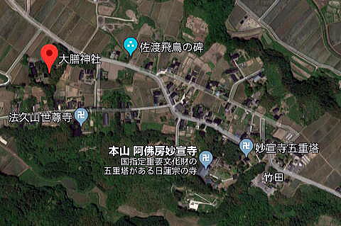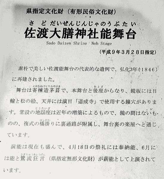 佐渡現地視察総合目次 大膳神社・能舞台① 大膳神社・能舞台② 大膳神社・能舞台③ 大膳神社・能舞台④ 佐渡滞在2日目、佐渡金山、佐渡奉行所、佐渡博物館などをじっくりと視察した後、大膳神社と能舞台を視察に行った。 すばらしい田園地帯一角には大膳神社のすぐ隣には妙宣寺はじめ寺院や神社がある。場所は竹田という地番にある。私たちが大膳神社に到着したときは、この間ずっと降っていた雨が上がっていたが、空はどんよりと暗かった。 大膳神社の住所:〒952-0302 新潟県佐渡市竹田562ー1 ![]() 出典:グーグルマップ ![]() 出典:グーグルマップ ![]() 出典:グーグルマップ 以下は大膳神社の参道を少し能舞台側に行ったところから撮影した竹田のすばらしい田園風景である。 ![]() 出典:グーグルマップストリートビュー 大膳神社の入り口には、以下の案内板があった。 ![]() 撮影:青山貞一 Nikon Coolpix S9900 さらに進むと以下の県指定文化財(有形民俗文化財)の解説板があった。この板には能舞台の解説とともに、平面図もあった。さらに英文概要(略)もあった。 ![]() ![]() 撮影:青山貞一 Nikon Coolpix S9900 以下は大膳神社能舞台の全景である。この能舞台は今なお現役であり、毎年奉納能などで使われているとのこと。 ![]() 撮影:青山貞一 Nikon Coolpix S9900 つづく |