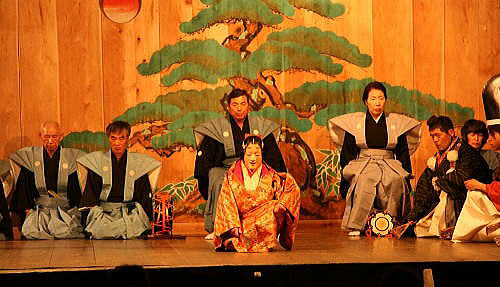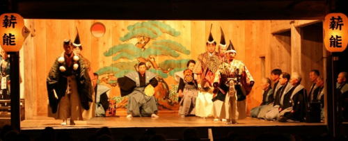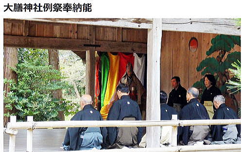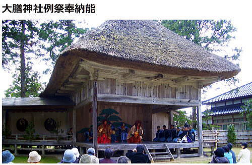 佐渡現地視察総合目次 大膳神社・能舞台@ 大膳神社・能舞台A 大膳神社・能舞台B 大膳神社・能舞台C ◆佐渡の薪能・演能の幕開けを告げる奉納能 佐渡の薪能 演能シーズンは大膳神社例大祭の奉納能から始まります。「国仲四所の御能場」のひとつ大膳神社の能舞台は、1846年に再建され佐渡に現存するものでは最古といわれています。緑に囲まれた中に立つ舞台は、茅葺き寄棟造りで趣きがあります。春の風を感じながら“佐渡の能開き”をお楽しみください。 ![]() ![]() 文・写真の出典:佐渡市公式観光情報サイト さど観光ナビ ◆薪能と鷺流狂言が奉納される大膳神社能舞台 大膳神社の能舞台は、佐渡に現存する最古のものと伝わります。「佐渡国仲四所の御能場」の一つとして古くから演能が行われている由緒ある能舞台です。松の絵に日輪を配した鏡板が特長。毎年定例能が行われ、鷺流狂言と共に神事芸能として奉納されています。 能の間に演じられる狂言には、大蔵流、和泉流、鷺流があります。「鷺流」は全国に3ヶ所のみ残る狂言の流派。山口県山口市、佐賀県千代田町と佐渡が伝えています。狂言は明治時代に入ると衰え、佐渡の鷺流狂言も昭和30年代に消滅したといわれていました。昭和50年代に当時の真野町に鷺流狂言の伝承者が確認され、本狂言が復活。佐渡鷺流狂言研究会が伝承と普及に努めています。 ![]() ![]() 文・写真の出典:佐渡市公式観光情報サイト さど観光ナビ つづく |
