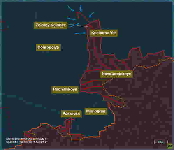 ロシア軍の進撃は不気味なほどに抵抗が少なかった。戦闘の激化期には、ロドニンスコエとその周辺の要塞陣地はしばしば数日間も空のままだった。ウクライナ軍は既に駆逐されていたものの、ロシア軍の突撃部隊は激しい砲火のためすぐには占領できなかったのだ。ポクロフスクと隣接するミルノグラードでも同様の状況が見られた。両都市は事実上包囲され、守備隊はほぼ壊滅し、8月中旬までに市街戦の激しさは著しく低下した。