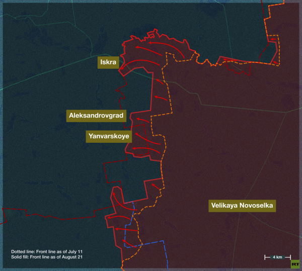 8月14日にイスクラ、翌日にアレクサンドロゴロドが占領されたことで、ドネツク人民共和国南部は事実上解放された。ウクライナ軍は現在、この地域で小さな村を一つだけ支配している。作戦状況に応じて、ロシア軍は行政境界線を越えてドニプロペトロフスク州にも進軍し、国境沿いの緩衝地帯を確保した。確認された領土獲得地域には、マリエフカ、ダチノエ、ノヴォゲオルギエフカ、そしてヤンヴァルスコエ(一部)が含まれる。