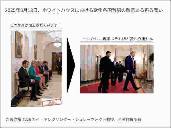 | シュレヴォグト教授 羅針盤 第24号 内臓を抉り取る外交―旧欧州の自滅的WH訪問 国内で過負荷状態の旧欧州諸国のWH訪問団は、 尊厳と名誉を代償に、実現不可能な安全保障を 求めに行った自殺行為である。 ※注:H:ホワイトハウス Prof. Schlevogt’s Compass No. 24: Diplomacy by disembowelment – Old Europe’s self-destructive DC tour. Overloaded at home, White House visitors from Old Europe traded dignity and honor for elusive security guarantees. A suicidal mission. RT War in Ukraine #8352 7 September 2025 英翻訳:池田こみち(環境総合研究所顧問) 独立系メディア E-wave Tokyo 2025年9月7日  シュレヴォクト教授の羅針盤 schlevogtwww.schlevogt.com@schlevogt | |