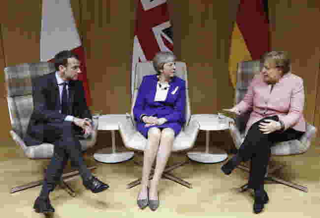 資料写真:2018年3月22日、ベルギーのブリュッセルで、英国のテレサ・メイ首相(中央)を囲んで、フランスのエマニュエル・マクロン大統領とドイツのアンゲラ・メルケル首相が並んでいる。© フランソワ・ルノワール / AP通信