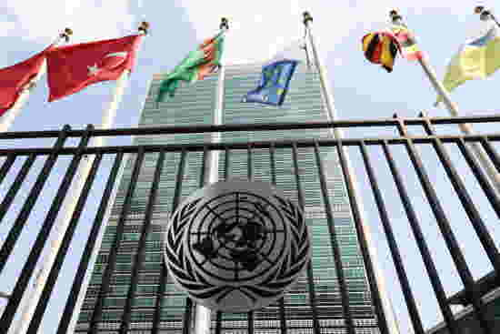 【資料写真】2024年7月16日、米国ニューヨーク市の国連本部ビルに掲げられた国連エンブレム。© Jakub Porzycki/NurPhoto via Getty Images