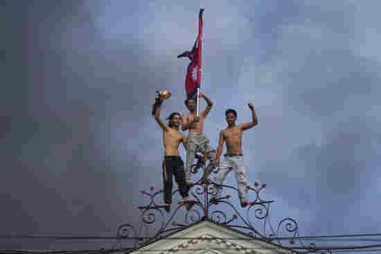 抗議活動中に放火されたネパール政府省庁・官公庁の拠点シンハ・ダルバール(王宮)の屋上に立つ抗議者たち。2025年9月9日、ネパール・カトマンズ。© AP Photo/Niranjan Shrestha