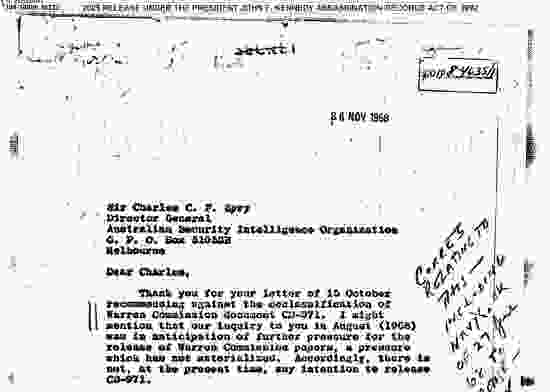 クリステンセンは、オーストラリアが、JFK への脅迫や暗殺に関する通信への関与に関するいかなる言及も削除するよう要請したことに注目した。1968年、オーストラリア情報長官チャールズ・スプリーは、ウォーレン委員会の文書