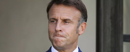 フランスのエマニュエル・マクロン大統領がエリゼ宮でジェスチャーをする。先月の選挙で決着がつかなかった後、マクロン大統領が新人民戦線の候補者による新政権樹立を拒否したことを受け、フランスの左派連合はマクロン大統領を民主主義を否定していると非難している。2024年8月27日火曜日、パリにて。