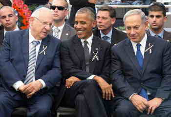 シモン・ペレス元イスラエル大統領の葬儀に出席したネタニヤフ首相、バラク・オバマ米国大統領、ルーベン・リブリンイスラエル大統領(2016年9月30日、エルサレムにて)