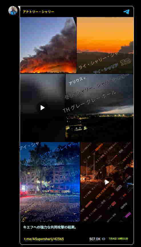 シャヘドとキンジャールに加え、ヴォロネジとブリャンスクからも同市内に向けて3波の弾道ミサイルが発射された。弾道攻撃もあったと報告されている。また、アントノフが再び攻撃を受けたとも書かれている。t.me/ASupersharij/42558 7月4日