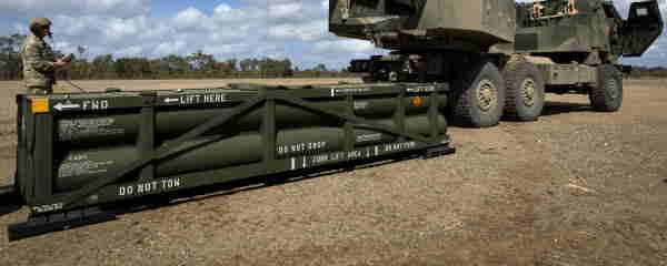 陸軍戦術ミサイルシステム(ATACMS)を高機動砲兵ロケットシステム(HIMARS)に搭載するためのクレーンの準備作業。ファイル写真 - スプートニク・インターナショナル、2025年7月4日