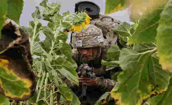 ザポリージャ地方でひまわり畑で訓練する兵士 - Andriy Andriyenko/ウクライナ第 65 機械化旅団 via AP