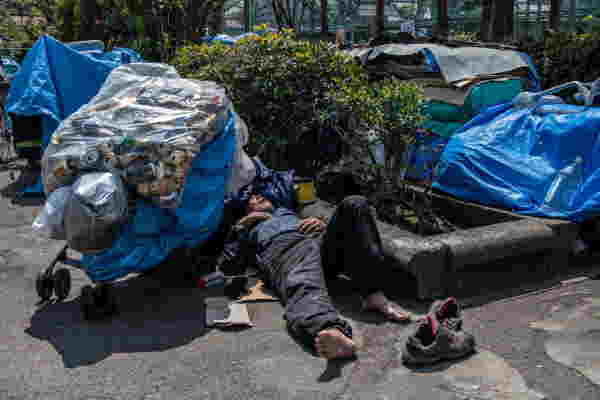 【資料写真】東京の公園で眠るホームレスの男性。© Carl Court/Getty Images