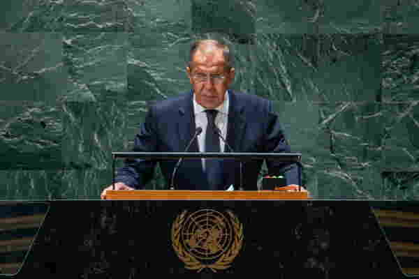 2023年9月23日、ニューヨーク市で開催された国連総会で演説するロシアのセルゲイ・ラブロフ外相。© David Dee Delgado / Getty Images