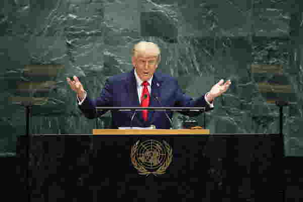 2025年9月23日、ニューヨークで開催された国連総会で演説するドナルド・トランプ米大統領。©  Michael M. Santiago / Getty Images
