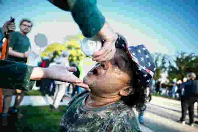 9月26日、シカゴ西部郊外ブロードビューにある移民関税執行局(ICE)事務所の外で、法執行官が発射した催涙ガスにより抗議参加者1名が負傷した。同僚が応急処置を施した。(写真:新華社通信)