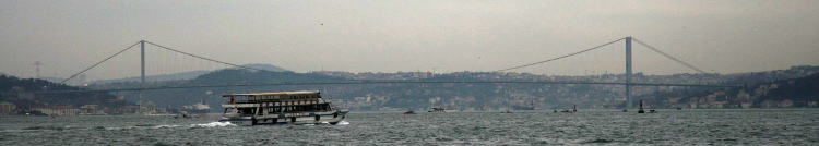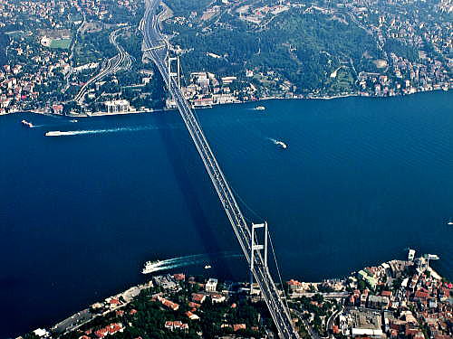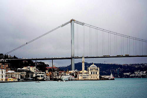 | 総合メニュー(中央・西アジア) トルコ1 歴史 トルコ2 文化 トルコ3 現代 2016年クーデター未遂 トルコ6 カッパドキア トルコ7 カッパドキア イスタンブル モスク モスク モスク2 モスク3 カパルチャルシュ ボスポラス海峡 ボスポラス大橋 エジプシャン・バザール トプカプ宮殿1 トプカプ宮殿2 プカプ宮殿3 トプカプ宮殿4 トプカプ宮殿5 トルコイスラム美術博物館 次はトルコのイスタンブールのボスポラス海峡に掛かる大橋です。 ◆イスタンブル ボスポラス大橋 シルクロードのひとつの難所、ボスポラス海峡は、現在、橋、海底トンネルで簡単に渡れますが、往時はそして現在も市民は定期船で渡っていました。 私達は国際会議に参加するため、アンカラ空港から飛行機で伊スタンブルの欧州側に来ていましたが、海峡オプショナルツアーに参加し船で対岸のアジア部分の名所におり、また青山の友人がアジア側にいたので、欧州側で待ち合わせ、アジア側にある彼の家を訪問しました。 ![]() 7月15日殉教者の橋(ボスポラス大橋) Source:Wikimedia Commons 7月15日殉教者の橋(英: July 15 Martyrs' Bridge)は、トルコのイスタンブールでボスポラス海峡に架かる吊り橋です。 かつてはボスポラス橋もしくはボスポラス大橋(The Bosphorus Bridge)と呼ばれ、ボスポラス海峡に架かるもう一つのボスポラス橋(ファーティフ・スルタン・メフメト橋・通称第二ボスポラス大橋)と区別するため、第一ボスポラス大橋と呼ばれることもありました。 歴史 ボスポラス海峡への架橋は、1957年に当時のアドナン・メンデレス首相によって決定された。完成は1973年10月30日、トルコ共和国建国50周年記念日の翌日のことです。 2016年7月15日に軍の一部が起こしたクーデター未遂事件では兵士が橋を封鎖し、これに抵抗した市民が犠牲になるなど象徴的な場所となりました。7月25日、ビナリ・ユルドゥルム(英)首相により現在の名称に改称されることが発表されました。 概要 ![]() Boğaziçi Köprüsü - Aerial view.jpg 空撮による7月15日殉教者の橋(ボスポラス大橋) Source:Wikimedia Commons 全長 - 1,510m 中央支間長 - 1,074m 幅員 - 39m(6車線) 高さ - 64m 主塔の高さ - 105m 全体の負荷がかかる橋梁中央部では、90cm程度たわんでいる。 ![]() 7月15日殉教者の橋(ボスポラス大橋)の欧州側支柱 Source:Wikimedia Commons 交通 ![]() 空撮による7月15日殉教者の橋(ボスポラス大橋) Source:Wikimedia Commons 交通量は約180,000台/日であります。平日は時間帯により中央線の位置が変わります。 平日朝の通勤時間帯は交通の多くがヨーロッパ側へ向かう西行きのため、6車線のうち4車線が西行き交通に割り当てられています。 一方、平日夕方は4車線がアジア側へ向かう東行き交通に割かれ、西行きは2車線のみとなります。開通後4年間は塔内エレベーターを用いて橋を歩いて渡ることができていましたが、現在では歩行者や商用車の通行は禁止されています。 橋の東側に料金所が設置されており、ヨーロッパ側からアジア側へ向かう車両に限り通行料が課されます。支払いは、OGSと呼ばれる料金自動収受システムもしくはKGSと呼ばれるプリペイドカードシステムに完全移行しており、2006年より現金による支払いはできません。 両岸への交通 両岸の交通には以下の方法があります。 ・定期船 イスタンブール市民の足として、両岸の各所に定期船の船着場があります。 定期船Source:Wikimedia Commons ・橋 三つの自動車用橋が架けられています。 ①7月15日殉教者の橋(1973年建設、別名ボアジチ大橋 (Boğaziçi Köprüsü)/第一ボスポラス橋、全長1074m) ②ファーティフ・スルタン・メフメト橋(1988年建設、日本政府開発援助により日本企業が参加、通称第二ボスポラス橋Fatih Sultan Mehmet Köprüsü、全長1090m) ③ヤウズ・スルタン・セリム橋(2016年建設、通称第三ボスポラス橋Yavuz Sultan Selim Köprüsü、全長1400m) ・海底トンネル ①ボスポラス水道トンネル:2012年に開通したデュズジェ県のメレン川からイスタンブルのヨーロッパ側へ送水する海底トンネルです ②マルマライトンネル: 日本の大成建設グループなどにより建設が進められました、総延長13.56km(そのうち海峡下の長さ1387m)の鉄道用海底トンネル(2004年5月24日着工、2013年10月29日開通)しています。 ③アブラシャトンネル(Avrasya Tüp Tüneli):、2016年12月20日に開通した自動車用海底トンネルです。全長14.6 km (うちマルマラ海の海底部は3.4 km)、総工費は12.5億米ドル(約1470億円)です。 ④大イスタンブールトンネル:2020年完成予定の自動車2方向と電車を各層で分けた3層トンネルです。
