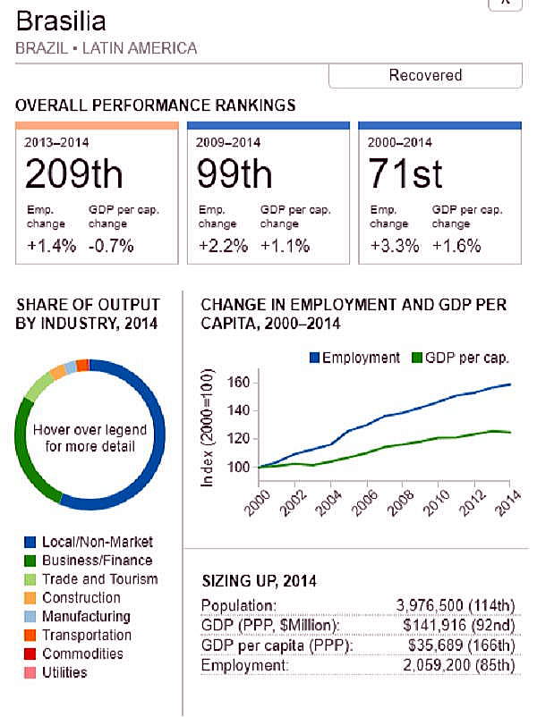カナダ・中南米 オリジナル出典:米国ブルッキングス研究所 ここではカナダと中南米諸国の大都市圏について、調査結果(総合、2000年〜2014年)を見てみます。 ![]() 出典ブルッキングス研究所(米国)https://www.brookings.edu/research/global-metro-monitor/ ◆カナダ カナダ(全数、7都市圏) カナダの大都市圏はいずれも米国との国境沿いにあり東側の太平洋に近い都市圏の伸び率が高く、アメリカ東部に近い都市の伸び率は中位か低く、成熟社会化しています ![]() 出典ブルッキングス研究所(米国) <世界300都市経済圏ランクマップ> 総合・一人当たりGDP・雇用 カナダ エドモントン大都市圏(83位/300) ![]() カナダ カルガリー大都市圏(90位/300)..青山、池田 ![]() カナダ ケベックシティ度試験(103位/300)青山、池田 ![]() カナダ バンクーバー大都市圏(122位/300)..青山、池田 ![]() カナダ トロント都市圏(133位/300)..青山、池田 ![]() カナダ オタワ都市圏(140位/300) ![]() カナ_ ウィニペッグ都市圏(151位/300) ![]() カナダ モントリオール都市圏(159位/300)..青山、池田 ![]() 。 中米 中米(全数、4) ![]() 出典ブルッキングス研究所(米国) メキシコ プエブラ都市圏(98位/300) ![]() メキシコ モンテレー都市圏(109位/300) ![]() メキシコ グアダラハラ大都市圏(120位/300) ![]() メキシコ メキシコシティー大都市圏(130位/300) 青山 ![]() 南米 ![]() 南米(全数、18) ペルー リマ都市圏(60位/300) ![]() コロンビア メディリン都市圏(63位/300) ![]() アルゼンチン ブエノスアイレス都市圏(87位/300) ![]() ブラジル ブラジリア都市圏(71位/300) ![]() ブラジル ベロオリゾンテ都市圏(75位/300) ![]() ブラジル レシフェ都市圏(76位/300) ![]() ブラジル クリティバ都市圏(82位/300) ![]() ブラジル グランデ・ヴィトーリア都市圏(86位/300) ![]() ブラジル サンパウロ都市圏(95位/300) ![]() ブラジル フォルタレザ都市圏(101位/300) ![]() ブラジル・キャンピナス都市圏(102位/300) ![]() ブラジル・サルバドール都市圏(115位/300) ![]() ブラジル リオデジャネイロ都市圏(127位/300) ![]() ブラジル ポートアレグレ都市圏(131位/300) ![]() ヴェネズエラ カラカス都市圏(126位/300) ![]() コロンビア ボゴタ都市圏(51位/300) ![]() チリ サンチアゴ都市圏(74位/300) ![]() プエルトリコ サンフアン都市圏(297位/300) ![]() 以上、カナダと中南米の都市圏の順位を見てきましたが、おおよそ以下のことが言えます。 カナダ、メキシコは、すべての都市圏が中位の位置にあり、南米諸国は、最上位グループ、第二位グループにあることが分かる。 <カナダ、中南米地域都市圏の分布> 1位から 60位 コロンビア、ペルー 61位から120位 アルゼンチン、ベネズエラ、ブラジル 121位から180位 カナダ、メキシコ、コロンビア 181位から240位 該当なし 241位から300位 該当なし つづく G7へ