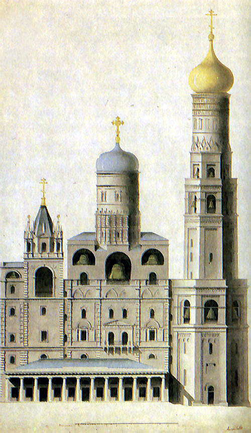 | ロシア短訪・総目次に戻る ・イワン大帝の鐘楼 概要 1812年の損傷 大鐘楼とリゾポロジェーニエ教会 設計イラスト 鐘楼と大砲 ◆モスクワ市概要 ![]() モスクワ市の紋章 ◆イワン大帝の鐘楼とリゾポロジェーニエ教会の設計イラスト イワン大帝の鐘楼については、平面図(PLAN)、立面図などはあまり残っていないようです。以下は数少ない設計にかかわるスケッチ、イラストです。 ![]() Draft of the new Ivan the Great belfry, Ivan Yegotov, 1815 1815年におけるイワン大帝の鐘楼の概要計画 Source:Wikimedia Commons ![]() Source :http://www.liveinternet.ru/users/4085298/post346924210/ ![]() Source:LIVEINMSK.RU ![]() Draft of the new Ivan the Great belfry, Giovanni Gilardi, 1815 1815年のイワン大帝の鐘楼の設計草案 Source:Wikimedia Commons ![]() Draft of the new Ivan the Great belfry, Giovanni Gilardi, 1815 1815年のイワン大帝の鐘楼の設計草案 Source:Wikimedia Commons ![]() Почтовая марка イワン大帝の鐘楼などをモチーフにした1988年のソ連時代の記念切手 Source:Wikimedia Commons ![]() олокольня Ивана Великого и звонница. Монета Банка России ? Серия: ≪Памятники архитектуры России≫, 3 рубля, серебро, 1993 год Source:Wikimedia Commons つづく |