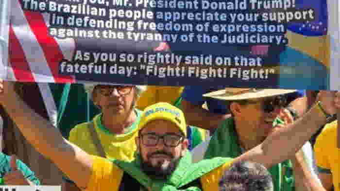ドナルド・トランプ氏のブラジル司法に対する行動を支持するプラカードを掲げる抗議者。2025年8月3日。 - スプートニク・ブラジル、2025年8月3日 c 写真 / 複製 X/@nikolas_dm